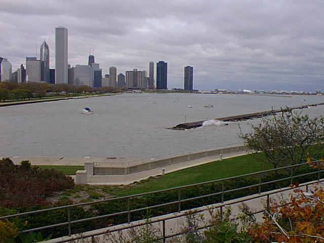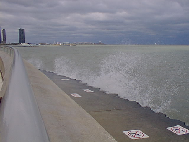 Surf's Up! With the whistling wind and an occasional crash you can see why they toughened the shore along Lake Michigan. Unprotected areas are forever being reclaimed because of erosion This mid October photo shows a smaller wave breaking against the concrete in front of the Shedd Aquarium. Late fall or winter storms easily break waves over the lower walk and against the curved wall with spectacular results. Perhaps I'll fight the cold to take some photos this winter.