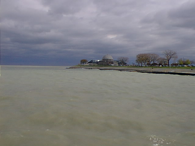 The Adler Planetarium a little closer in from the same shore walk but this time in October. The sky has a much more ominous feel to it and light differences give the cold water a sullen and frigid look. Click here to see a live cam looking back towards Chicago from the top of the Adler Planetarium.