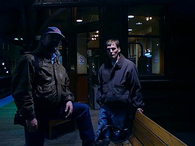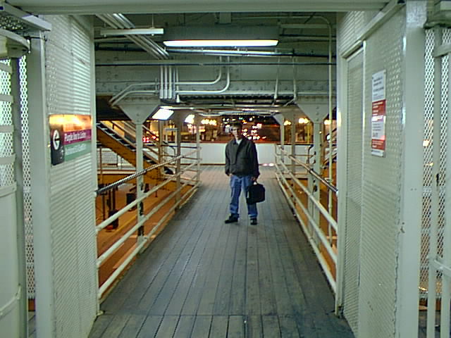 A spooky available light shot of Andy and myself after a trip to the Sears Tower. 9 o'clock on a nearly deserted Quincy Street EL platform. Where as the Metra Electric trains are more modern the EL system has the character of an old fashoned rail system. Antique looking stations. And just the nature of the elevated railway makes it an experience worth a try for any visitor to Chicago.