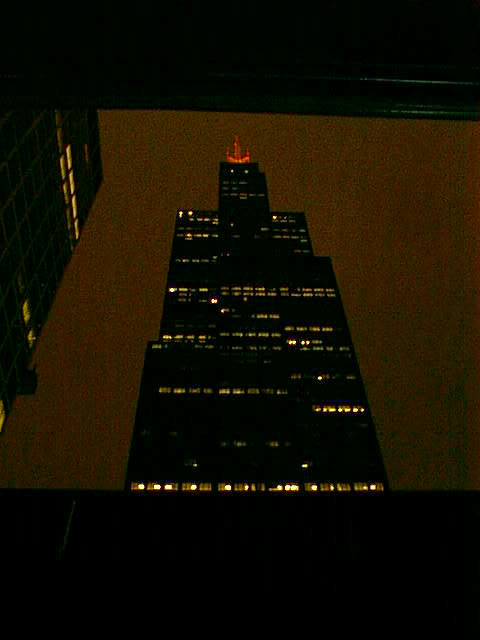Chicago's Tallest building is the Sears Tower. Seen from the 'El' platform in a cold October night. The top of the tower is orange for Halloween.