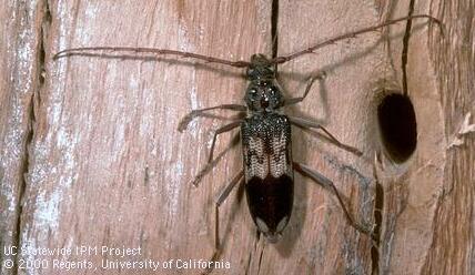 round headed wood borers), feed on live trees that are old or weakened or fire- or insect-killed trees but do not attack harvested lumber. They cause problems, however, when they emerge from wood in newly constructed buildings, leaving small circular or oval exit holes in the wood. Infested wood must be kiln-dried before it is used for lumber to avoid these problems. Species of these beetles may also be observed in the home if infested firewood is stored inside; however, they will not attack wood structures or furniture.