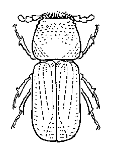 Adults are dark brown or black, sometimes with reddish mouthparts, legs, and antennae. Adults of most species are about 1/4 inch long, but in some species, adults reach 1-1/2 to 2 inches in length. Adult beetles have a humpback appearance, so their head is not visible when viewed from above. This characteristic is also seen in deathwatch beetles.