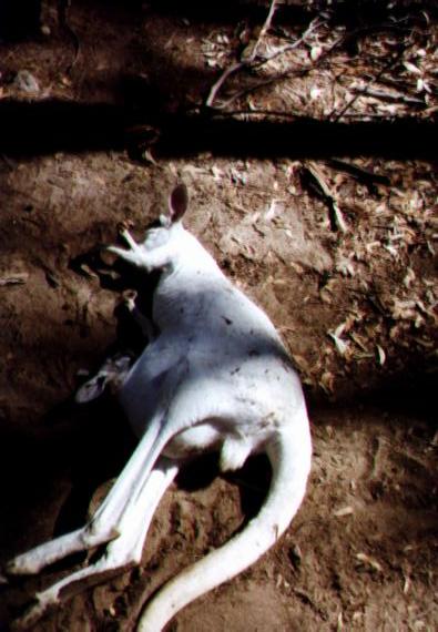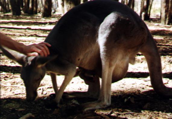Un kangourou albino et son petit dans la poche faisant dodo |