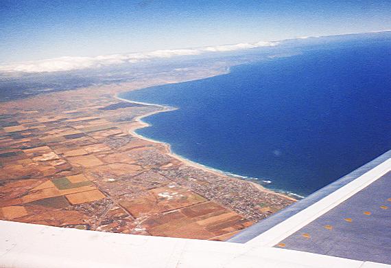 Vue d'Adelaide et de la plage, lors d'un depart vers Melbourne;l'herbe jaunie vite dans ce climat arride! |