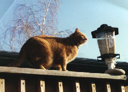 Harpo is a really fat (14 lbs) cat who lives on my mom's table. Also the couch. this picture is one of the legendary times he goes outdoors. He is really cute anyway, and, oh, I forgot, lives in the barn quite comfortably, though not quite. No, I will not put your favorite picture of you with the fish on my page, Harpo. Harpo drinks from the toilet, which I also will not show. He also looks both ways before crossing the street. His territory: the barn, mom's work table.