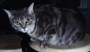 Willow is only a fraction of a pound smaller than Harpo, though not in this famous picture: Willy on the drum. My dad plays African drums, and here is Willow on one of them. I love Willow so much. She begs from the table and has to get her share of cream every morning or she will die. She is our only mouser. Her territory: the house, cat door, backyard, and sideyard.