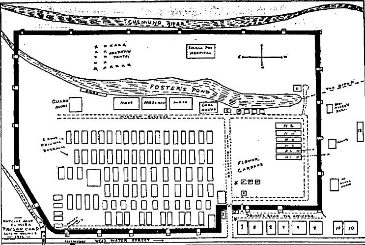 A. Main entrance to prison camp. B. Officers' private entrance to camp. D. Dead House, where bodies were prepared for burial. E. Officer of the day and guard tending main gate. H. The six new hospital barracks P. Officers' tents. R. Commandant's office. S. Sutler's store. T. Mess house of the sixteen police sergeants. The three buildings on right are their sleeping quarters. X. Tunnel outlet from Hospital No. 1. Z. Unfinished tunnel under Hospital No. 2. 7. House for guards when off duty. 8. Officers' quarters 9. Colonel Moore's living quarters. 10. Officers' quarters. 13. Barracks of 16th V.R.C. Flagpoles, one inside camp, the other at the corner of Colonel Moore's quarters. Observatory seen on left, located on opposite side Water Street. The famous tunnel is shown near northeast corner of camp. This is a mapof the intestines of Elmira Prison camp. |