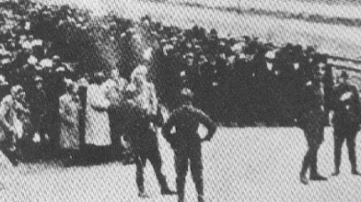 the ranks of people wait for the selection shouting "Zwillinge aus!" Twins