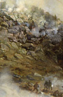 | Day3- On July 3, Lee's artillery opened the bombardment that for a time engaged the massed guns of both sides in the thundering duel for supremacy, but did little to soften up the Union center of Cemetery Ridge. The climax of the battle came when Major General George E. Pickett, in the desperate attempt to recapture the partial success of the preceding day, spearheaded a mass forty of some 12,000 Confederate troops across the open field toward the Union center on Cemetery Ridge. Raked by artillery and rifle fire, Pickett's men but failed to brake the Union line and the magnificent effort ended in disaster. In 50 minutes, 10,000 in the assault had died, and the attack forever to be known as Pickett's charge. |