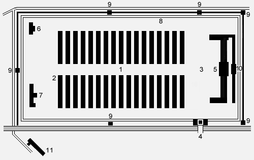 8. Ditch, electrified barbed-wire barrier and wall surrounding the camp