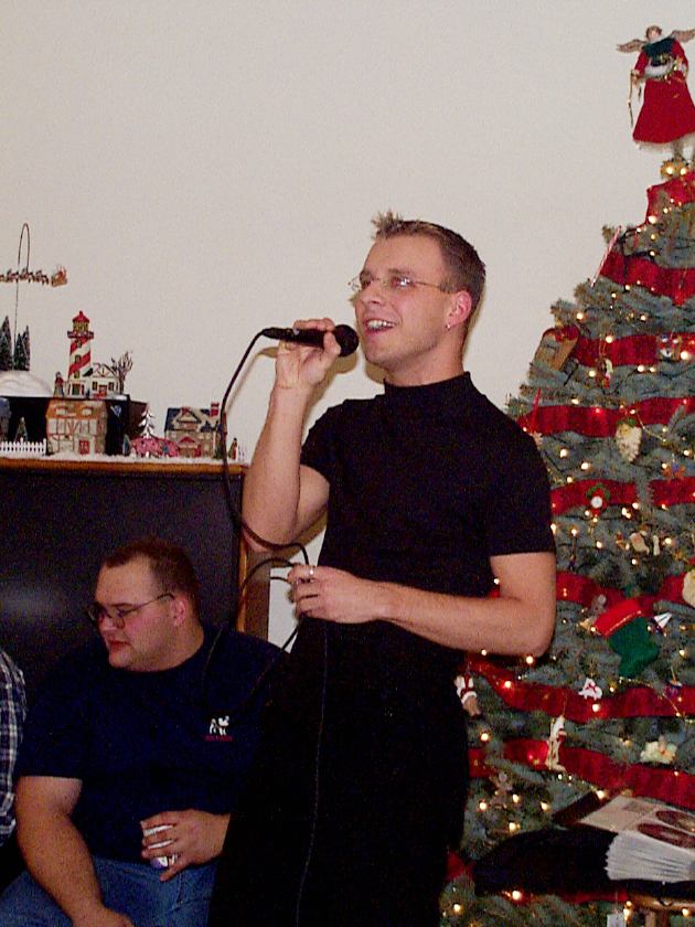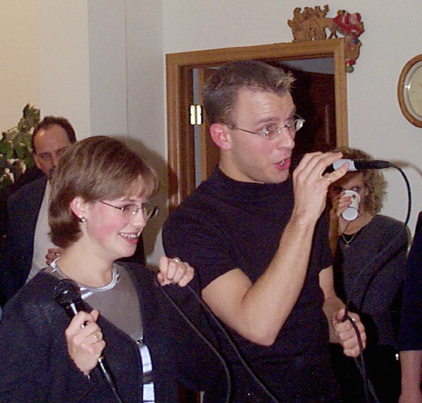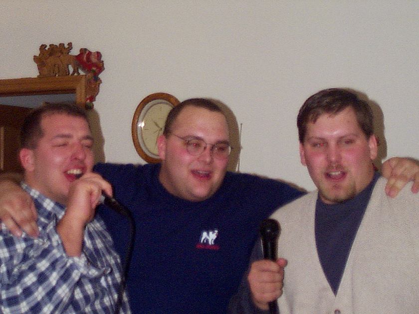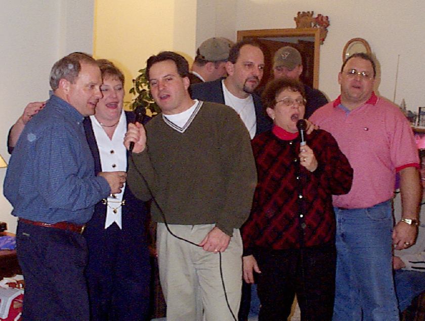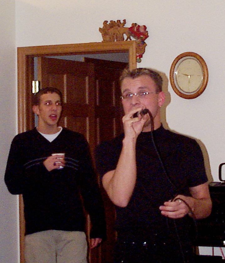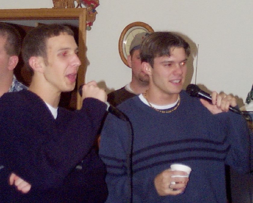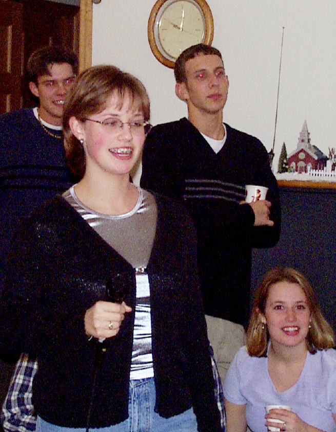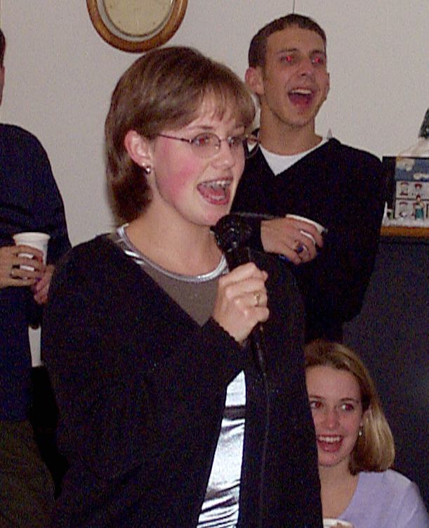 Melissa singing with Mark, Brad, and friend looking on.