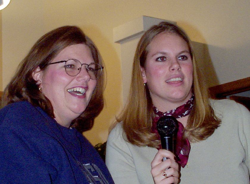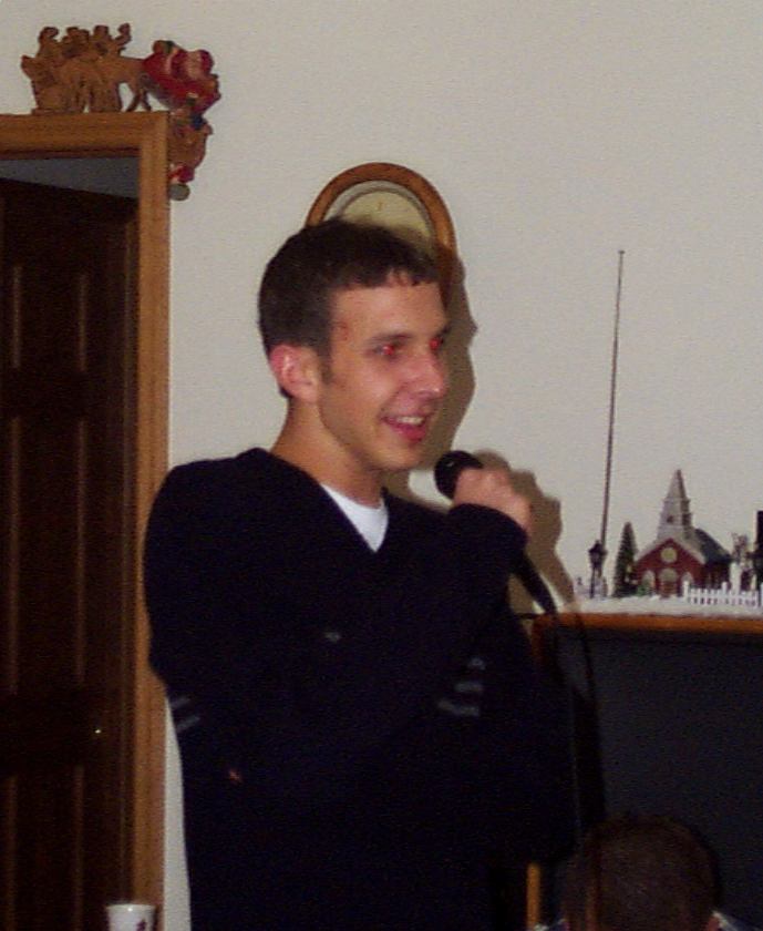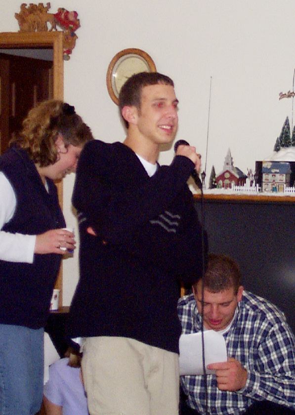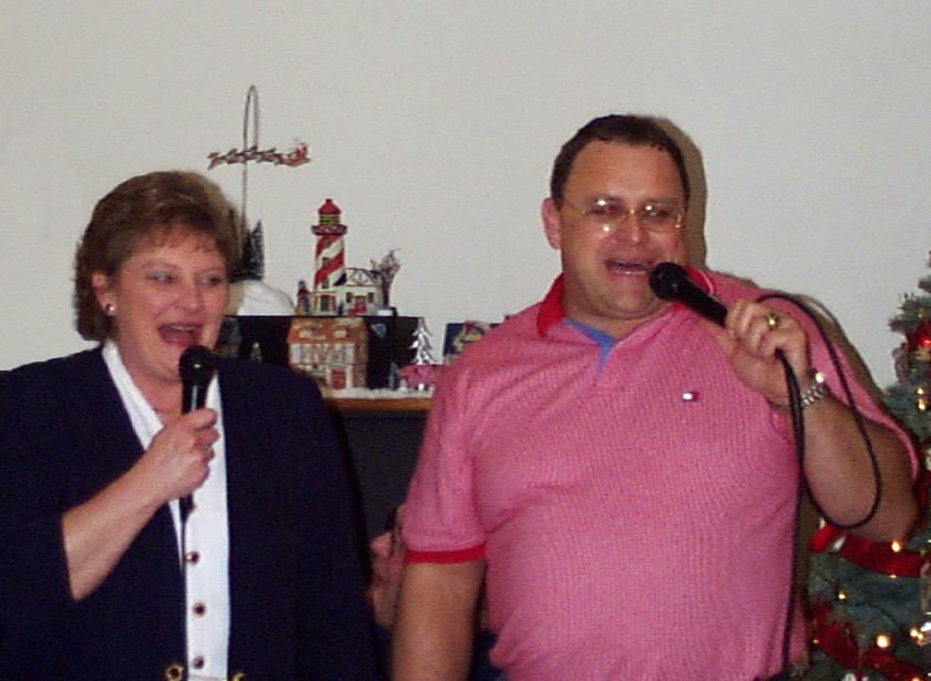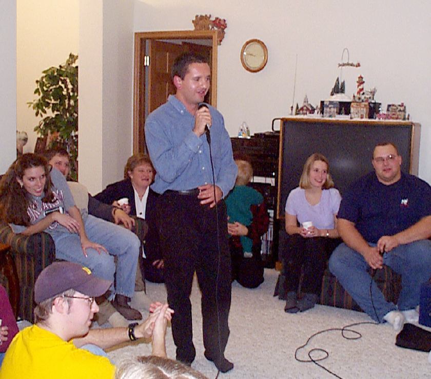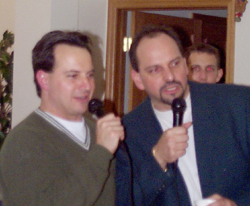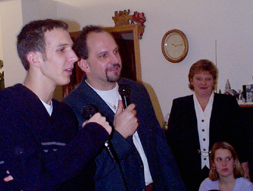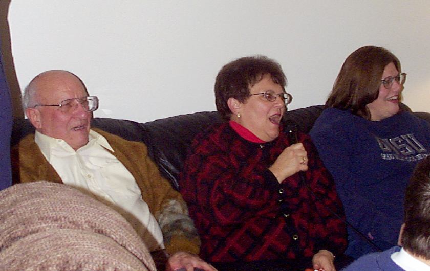 Melissa singing with Mark, Brad, and friend looking on.