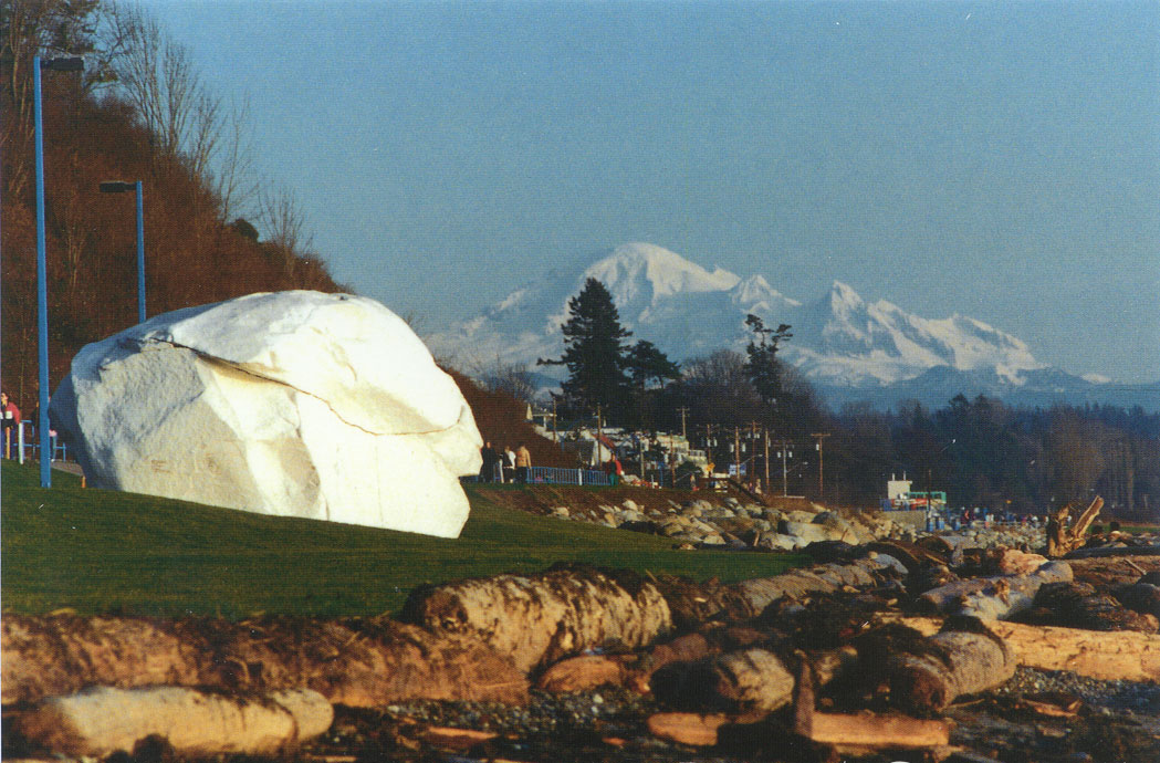 And here is my town, White Rock, BC, Canada. I live about a block off the beach. The mountain you see in the distance is Mt. Baker, Washington. And that big white rock is the--you guessed it-- WHITE ROCK. I'll let you in on a little secret--they gotta spray paint the rock to keep it white. |