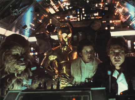This page is dedicated to my favorite Science Fiction series: Star Wars. In here I'll be putting up images and sounds taken straight from the movies. Just scroll down and click on the links to view/listen to them. In the column to the right you'll see a small description or commentary and the size of the image or sound. This is for those of you who have rather slow ISP service like me, so you'll have an idea of how long you're gonna have to wait before actually slamming your fist into your computer monitor. I'll try and get more soon.