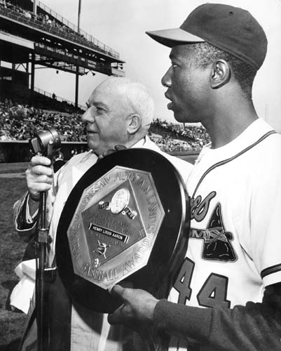 Born: February 5, 1934, Mobile, Alabama Bats: right Throws: right Elected to Hall of Fame by BBWAA: 1982 406 votes of 415 ballots cast: 97.83% Hank Aaron is synonymous with home runs, but there was much more to Hammerin' Hank than his 755 roundtrippers. He also set all-time marks for the most games, at-bats, total bases and RBI, and his batting average over 23 seasons was .305?indications of the all-around ability of this quiet man from Mobile. The National League MVP in 1957, he appeared in a record 24 All-Star contests with the Braves (Milwaukee and Atlanta) and Brewers.