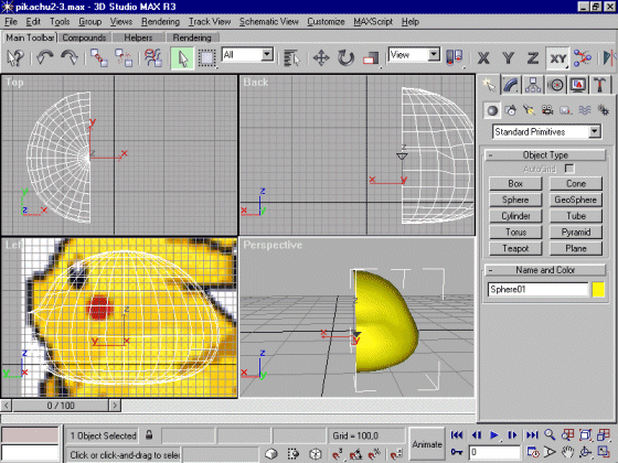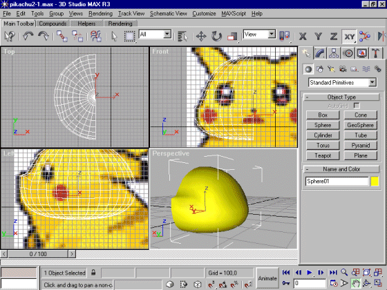 First I created a sphere to cover Pikachus' head. Then I added a 4x4x4 FFD modifier. I shaped the head in the front