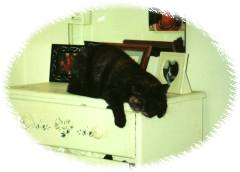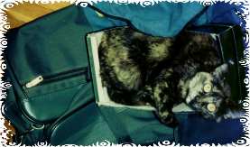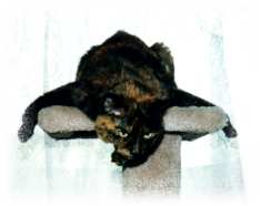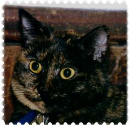Minnie belongs to my sister, Jennifer. I think she's 6 years old. She's always been a crazy cat. She has a problem with depth perception. She's been known to crash into windows and sail over the bed instead of landing on it. While lacking in that area, she does have some tricks, such as catching toy frogs while on top of her kitty condo. When she goes up north to visit the grandparents, she immediately takes over the house. She seeks out the favorite haunts of the resident cats (Webby and Tabby) and taunts them. She and Webby seem to have an especially adversarial relationship. It is rumored that she is the "favorite" of the grandmother. Her nicknames include "Foam" and "Sport."