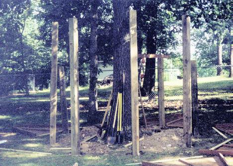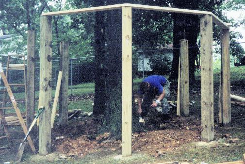 Next came the posts. Eight 6" x 6" posts on the outside and eight 4" x 4" posts on the inside. My dad's best friend Mike joined in the "fun" at this point. We aren't sure why, Dad said something about Mike having "masochistic tendencies," whatever that means. Anyway, the posts are buried in cement-filled holes about 24" deep.