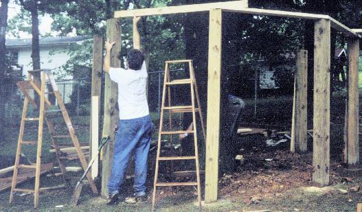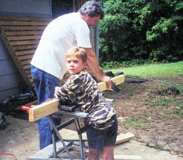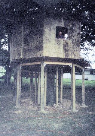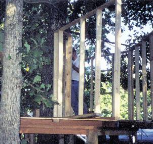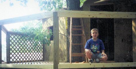 In the summer of 1999, Dad and I decided to build a treehouse. We didn't want to mess up a perfectly good oak tree by nailing into it, so we decided to surround the tree with a deck and build the house on a portion of that...