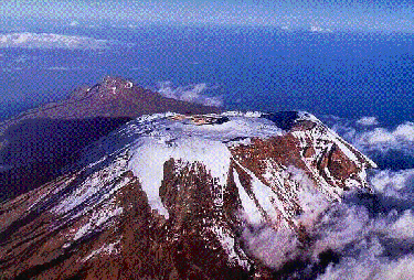 To the right is a fragment of very light volcanic rock taken from the summit. The sumit is characterised by arctic conditions - freezing cold at night and burning sun during the day. Oxygen is about half that at sea level and there is little atmosphere to protect you from the sun's radiation. There is virtually no liquid surface water. Rain enters the porous rock immediately, but the rest of the moisture is locked up in snow and ice.