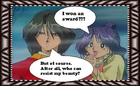 My very first award! Awarded to me on April 11, 2000 for my FYM (Fushigi Yuugi Microcosm). Thanks, Cookie! Click on the award to visit her kawaii Ayashi no Ceres site! The name of my site is misspelled on the award but I don't care because it's my first one...it's actually good enough to deserve an award? *bows* thank you, thank you all, you're just too too kind...