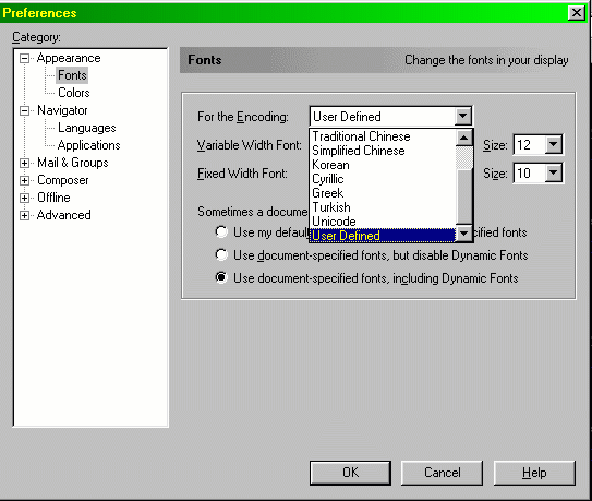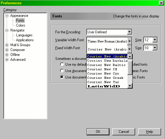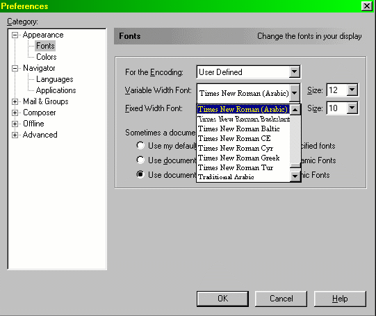 2- Chose Fonts, then chose User Defiend from " For the