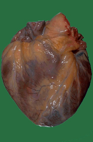 This is the external appearance of a normal heart.The epicardial surface is and glistening.The amount of epicardial fat is usual.The left anterior descending coronary artery extends down from the aortic root to the apex.