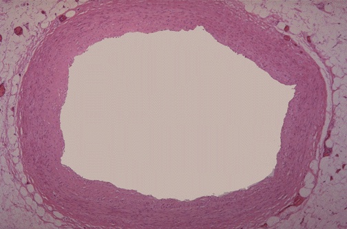 This is a normal coronary artery. The lumen is large, without any narrowing by atheromatous plaque. The muscular arterial wall is of normal proportion.