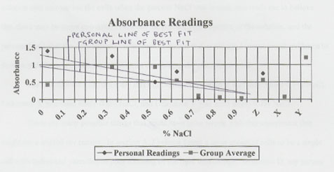 Because the experiment demonstrated that more hemoglobin was released into the solution that surrounded the cells when the percent NaCl was lowest, this leads me to believe that there may be some correlation between the percent NaCl content of the solution, and the percent NaCl that the cells themselves contain. I do not feel as though I have enough evidence to draw any definite conclusions at this point concerning the osmosis process.