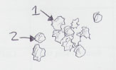 These cells appeared light lime color, or pale green. They appeared crumpled (1), however some were still well formed (2).