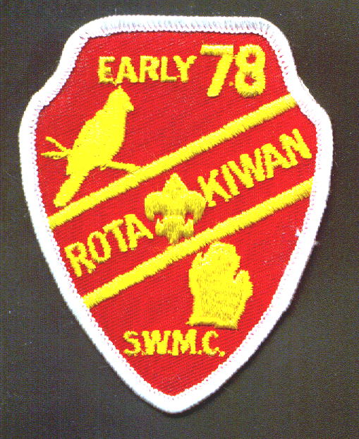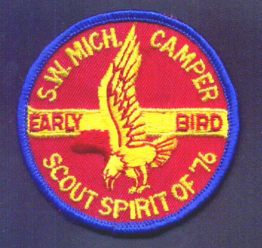 This patch is significant for a variety of reasons. First of all, it is the first of the long lasting "Bird" series, which went into the 1990's. Second of all, it is the first "Early Bird" patch that I know of. In an attempt to entice troops to sign up for camp early the council (now the Southwest Michigan Council) offered an extra patch to those troops who signed up for camp before a particular date. These were always known as the "Early Bird" patches and often featured a similar design as the standard issue patch for the year. In this case the 1976 patch is almost exactly the same, with the exception that it is much more colorful.