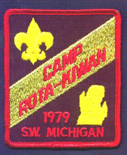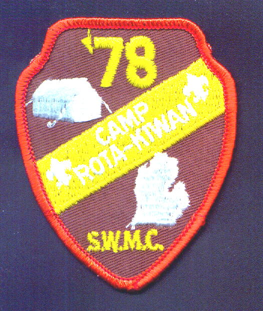 This was the 50th Anniversary patch for camp and it featured a map of the camp's boundaries at the time. Note that almost half of the camp's land was located across 9th Street around Fish Camp Pond. This land has long since been sold, but is still in it's natural state. I've been told that it was used at the time for wilderness survival. The area in red on the patch was the original boundary of the camp: more or less the are from the waterfront to the fishing area and a little ways up the hill to the administration building. Notice also that the area where Cedars Cabin is today had not yet been purchased, and the FBAC in the lower right hand corner is short for Fruit Belt Area Council, as the Southwest Michigan Council wasn't formed until 1973.