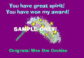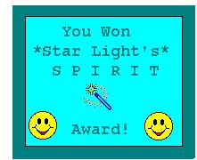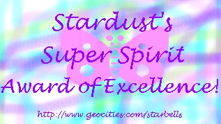 I was so happy to recieve the above awards, that I created one of my own. If you feel your site has spirit and want to win my spirit award, click on the sample award to go to the form. Good luck to ya :-)