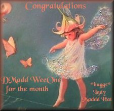 I have been chosen as Wee One of the MONTH!! Wow that is soooooo cool!! THANKS!! I guess all you have to do is dust dust dust and get the report in on time, or early like I've been doing. I think it's easier to do the dusting right away and make sure it's done. :o) Or maybe it's because I sent everyone to the rubber room?