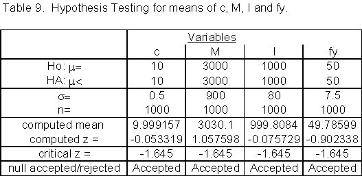 The mean of the population for each random variable was tested against the value given in Table 1 in the problem statement. In order to analyze the means, hypothesis testing was used. The procedure followed for each is outlined below: