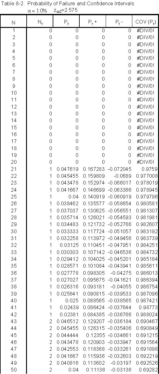 Confidence intervals represent a range of values in which the true value can be expected to lie. (Ayyub 1997) The equation determining the confidence intervals for Pf versus sample size is as follows: