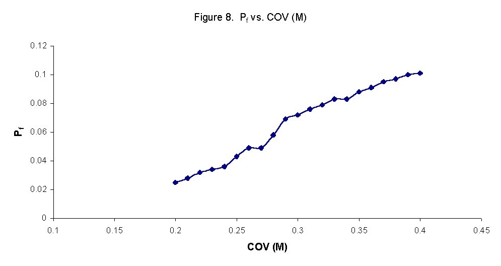 Figure 8 shows the effect of varying the coefficient of variation of M, COV(M), on probability of failure, Pf. It can be seen that as the coefficient of variation of M increases, the probability of failure increases linearly.