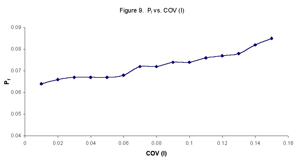 Figure 9 shows the effect of varying the coefficient of variation of I or COV(I), on probability of failure, Pf. It is clear that there is a linear relationship between the two variables and that Pf increases as COV(I) increases.
