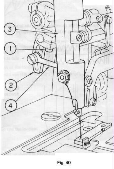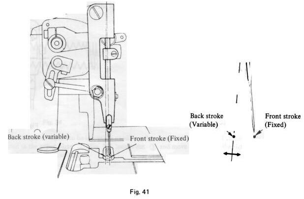 To adjust the front stroke loosen setscrew (1) Fig 40 and adjust the inclination of needle bar rocker assembly.