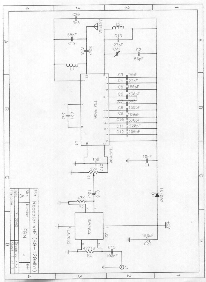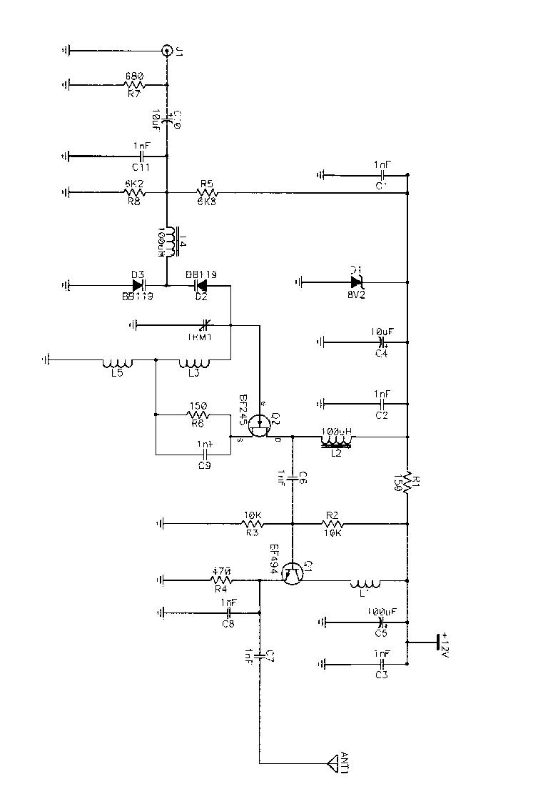 Os capacitores que não são eletrolíticos devem ser obrigatoriamente cerâmicos devido à alta freqüência de operação. A fonte de alimentação (12 V) deve ser muito bem filtrada e regulada de preferência. L2 e L4 são microchoques comprados prontos no comércio, enquanto que L3 e L5 consiste em uma bobina de 6 espiras de fio de cobre AWG 18 em núcleo de ar de 1cm de diâmetro com tomada central. D2 e D3 são diodos varicap encontrados com facilidade no comércio.