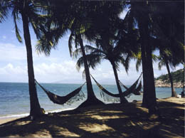 | Here are the hammocks on Magnetic Island in Queensland which was my first stop after Cairns and scuba diving on the Great Barrier Reef (totally amazing!). I love this picture even though I was a Billy no mates as all I did all day was lie in the hammock on the left and read 'One Flew over the Cuckoo's Nest' from cover to cover. |
