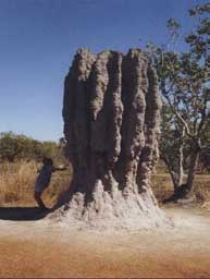 | Again this is in Kakadu and is our guide standing beside a Cathedral termite mound. These huge structures are actually built by tiny little termites who are blind and any little bit you break away a team of them rushes out to rebuild. Reminds me of something I saw on Star Trek once... . |