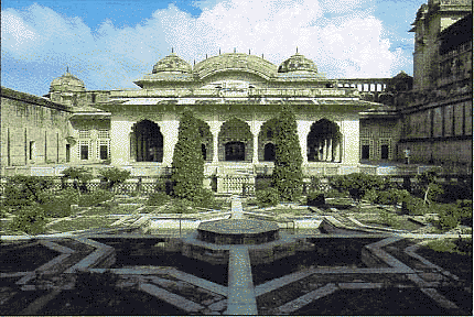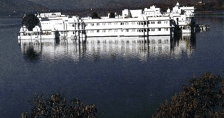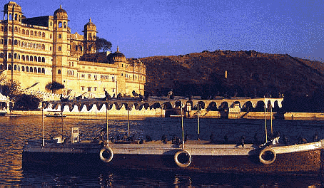 Mewar, built in 1746 by Jagat Singh. Set on an island, the whole palace appears to float on the blue waters of Lake Pichola. The airy stucco complex with dainty balconies, terrace gardens, fountains and arched windows, reflects the brightness of the sun, sky and lake. The interiors are lavishly decorated with paintings, stained glass and