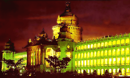 India, Vidhan Soudha, is located at the northern boundary of the Cubbon park, in the city of Bangalore. It is a granite structure built in the neo - Dravidian style of architecture. Conceived and executed by Kengak Hanumanthaiya, the then Chief Minister, it houses both the State Legislature and Secretariat. The massive sandalwood door of the Cabinet room is a spectacular feature of this imposing building. |