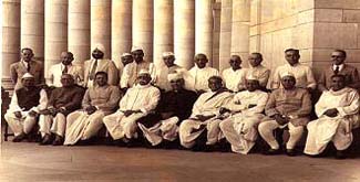 This picture of the Provincial Premiers and representatives with Members of the Interim Government was taken on the occasion of the Premier's Conference at New Delhi in October 1946. (Seated from left to right) Shree Krishna Sinha (Bihar), Dr. Khan Sahib (NWFP), Hari Krishna Mahtab (Orissa), Pandit Ravishankar Shukla (CP), Nawab sir Muzzafarali Qazilbash (home minister, Punjab), T. Prakasam (Madras), B.G. Kher (Bombay), Pandit Govind Ballabh Bardoloi (Assam). (Standing from left to right) Sir Shafaat Ahmed Khan, Dr.John Mathai, Sardar Baldev Singh, K.B. Sahai (revenue minister, Bihar), Dr. Rajendra Prasad, Pandit Jawaharlal Nehru, Sardar Vallabhai Patel, Syed Ali Zaheer and C.H. Babha.