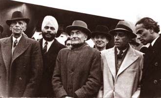 Indian leaders arrived in London for talks on 2nd December 1946. Seen in the picture (from left) Muslim leader Mohammed Ali Jinnah, representative of the Sikhs Sardar Baldev Singh, British secretary for India Patrick Lawrence, along with vice-president of the interim government Pandit Nehru and V.K. Krishna Menon.