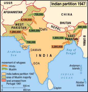 India was partitioned into India and Pakistan (East Pakistan, which at present is known as Bangladesh, and West Pakistan) on the basis of religion, Pakistan with Muslim majority and India with Hindu. Some parts of India (Diu, Daman and Goa) were under the Portugese rule which were later freed in 1961.