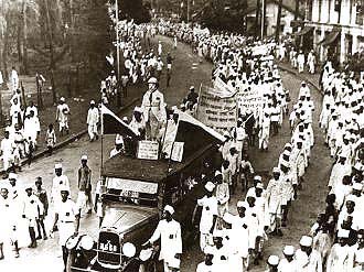 In 1930 Gandhi gave the call for continuing the Civil Disobedience Movement started in 1921 but suspended by him in 1922 after violence at Chauri-Chaura. This time too, large number of people participated in demonstrations and protest marches across the country. In this picture, an effigy of a British soldier is being carried in a procession through Bombay streets for being burned.