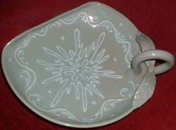 unusually shaped green bowl with cream slipware decoration. handle with leaf design. approx 8.5"x9.5"