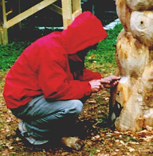 ![]() Christophe Doucet on the right and his sculpture which he later called "Laura" after a brand name on the chocolate we got with our beverages. He had burned out the centre. Click for more about this work. |